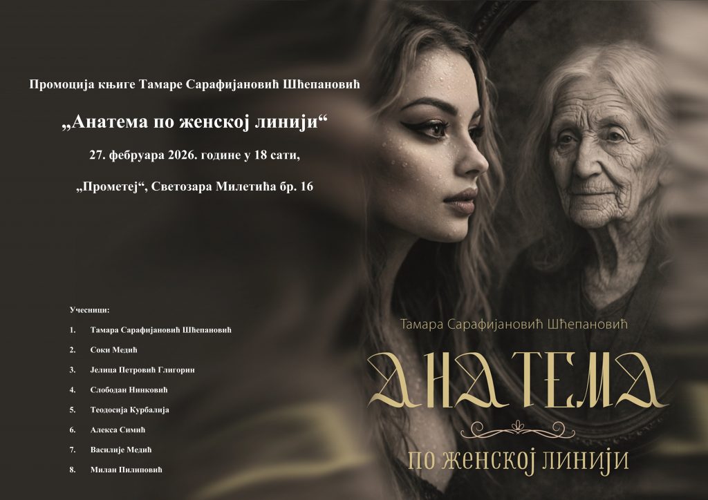 У Галерији издавачке куће Прометеј у Новом Саду (Светозара Милетића 16), биће одржано представљање књиге „Анатема – по женској линији“ ауторке Тамаре Сарафијановић Шћепановић, у петак, 27. фебруара, са почетком у 18 часова.