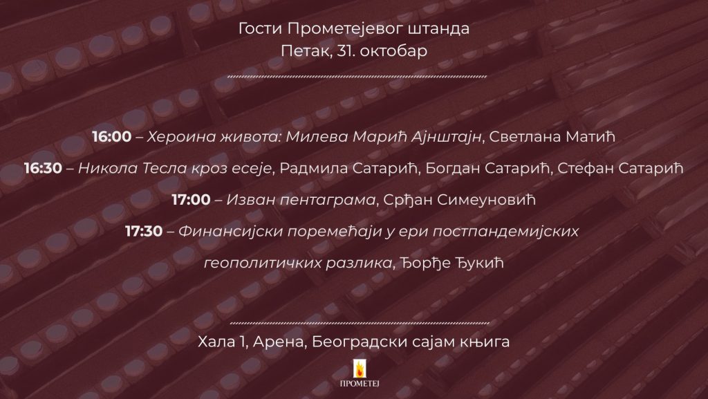 📖 Петак, 31. октобар, на штанду Издавачке куће Прометеј доноси низ промишљених и инспиративних разговора о науци, књижевности и друштву. Од судбине Милеве Марић Ајнштајн, преко есеја посвећених Николи Тесли, до савремених економских и филозофских промишљања – данас нас очекује богат и разноврстан програм:
