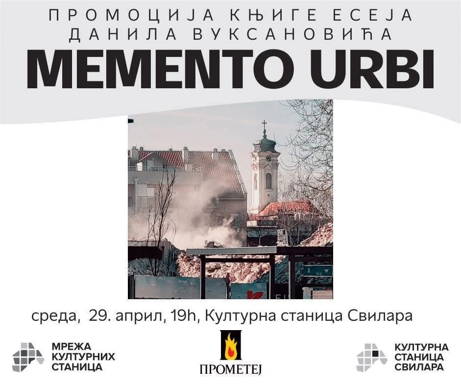 Издавачка кућа Прометеј вас позива на представљање књиге „Memento urbi – есеји” Данила Вуксановића у среду, 29. априла са почетком у 19 часова, у Културној станици Свилара.