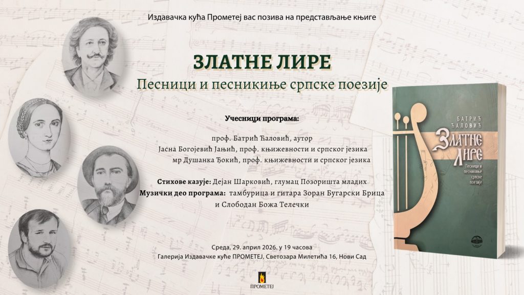 Издавачка кућа Прометеј вас позива на представљање књиге „Златне лире – песници и песникиње српске поезије” Батрића Ћаловића у среду, 29. априла са почетком у 19 часова, у Галерији издавачке куће Прометеј (Светозара Милетића 16, Нови Сад).