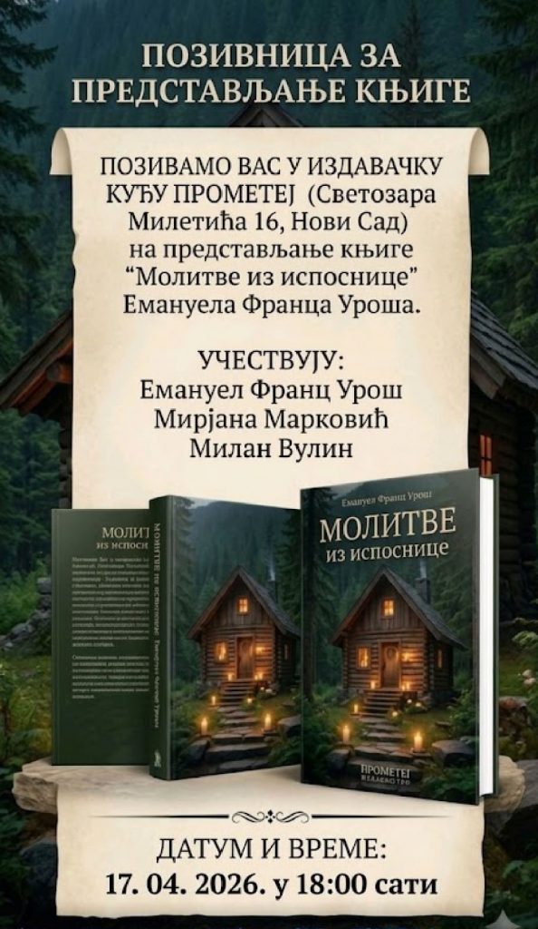 Издавачка кућа Прометеј вас позива на представљање књиге „Молитве из испоснице” Емануела Франца Уроша у петак, 17. априла са почетком у 18 часова, у галерији Прометеј (Светозара Милетића 16, Нови Сад).