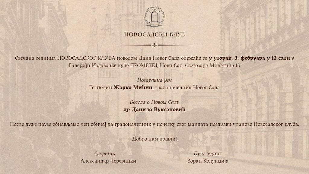 Настојећи да истрајемо у напорима да следимо добре програмске активности из ранијих година рада Новосадског клуба, организовали смо свечану седницу клуба поводом Дан града Новог Сада.